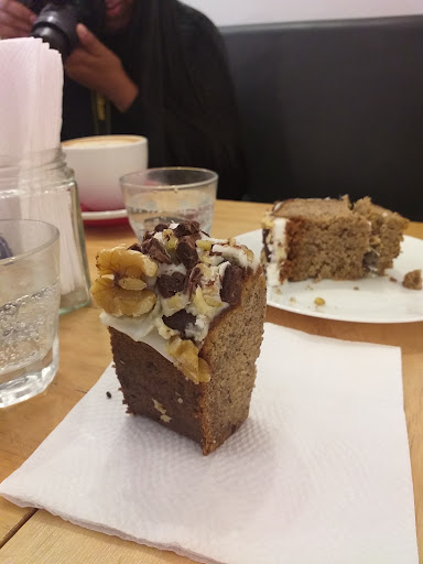 Soy de buen comer, pero quede reventada con todo. La chica que nos atendió también, re amorosa y atenta. Nos dio cubiertos para el bagel y al ratito vino a traernos tenedores con la torta. Me paso en la mayoría de lugares que te tenes que arreglar con un solo tenedor para todo lo que pedis.