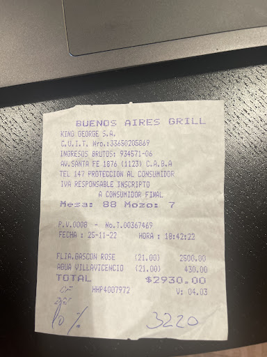Read moreDecided to stop here for lunch with my family during a stroll around this city. The waitress shared the specials of the day. My daughter and I selected the grilled chicken (one of the specials), my other 2 wanted burgers, and my husband ordered the full order of Skirt steak (entraña) and a side of mashed potatoes. Everything was delicious, the burgers were huge, the chicken cooked perfectly and moist, and the steak was perfect. They do charge a table service per person and this seems to be a common thing in restaurants in Buenos Aires. The specials included a drink and a coffee and the price was about $7 dollars for this plate. Burgers about the same price and the steak a little more....