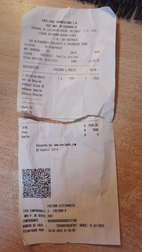 Read moreLa atención en gral es buena(algunos días tardan mucho en atenderte o despachar) los productos son lo que se puede esperar de una cadena de comida rapida, o sea...ni. Si me parece super mal que cuando uno quiere pagar con dinero en efectivo, nunca tienen cambio, o te dicen (como me acaba de pasar) que es el primer billete que reciben y que no tienen cambio, que se llevaban todo a la mañana (son las 7:33 am de un miercoles), que si no tengo tarjeta para pagar, me parece mal que un local y en el lugar que se encuentra nunca tenga...