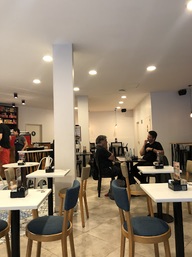 Excelente cafecito en el barrio!!! Se cortó la luz en mi casa, a 2 cuadras de este café, y decidí probar como era trabajar desde allí, pues las otras opciones del barrio habían resultado decepcionantes (mala internet, o mala atención, etc) Esta fue una reconfortante sorpresa!!! La esquina es súper luminosa, pues tiene ventanales gigantes...esa luz natural no se encuentra en otro sitio en el barrio. Cada mesa tiene acceso a un enchufe en caso que se necesite conectar uno o más dispositivos electrónicos. La atención fue muy amable todo el tiempo, y no me hicieron problemas por el rato que estuve (consumí algunas cosas, pero estuve varias horas trabajando). Para colmo, el día era de plena lluvia, así que estar seco, bien iluminado, viendo el transito pasar, y poder trabajar en ese ambiente, fue una experiencia...