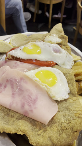 Portions are massive - we had some quid as a starter then Milanesa for 2. We couldn’t finish our food, but they packed up the leftover to take it home. The Milanesa was absolutely huge and it came with Spanish style fried potatoes and parsley/garlic sauce. Before you start they bring fresh bread and olives for the wait. It’s a trap, be careful, you will need some stomach space for later on :)