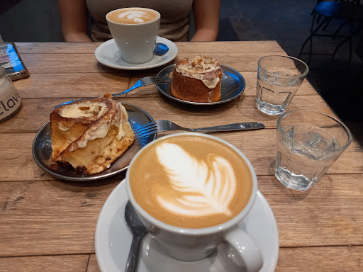 Vinimos con mi amiga a merendar, y nos llevamos una gran sorpresa! Teníamos mucha hambre y veníamos de hacer un par de cosas, así que de casualidad encontramos este lugar, que nos llamó la atención por su decoración linda y cálida. Apenas llegamos nos atendieron y súper dulce la mesera, de hecho después nos ayudó para encontrar la parada del colectivo, muy amable realmente. Además de su buen servicio, la comida no se queda atrás. Los precios están muy bien, y la verdad que riquísimo, mi amiga se pidió un capuchino, yo un flat white, y las dos un roll de canela. En cuanto a lo que pedí, el flat white me impresionó, una sola vez me pasó de que el café sea una experiencia al tomarlo, y hoy me volvió a pasar, así que quedé impresionada, era cremoso y sabroso, buenísimo. El rol de canela igual, muy rico, bien hecho, fresco, lo único que puedo criticar es que por ahí es azucarado de más, pero tampoco tanto y eso es cuestión de gustos, lo volvería a pedir de hecho. El espacio tiene buen tamaño, y como dije antes muy lindo ambientado, lamentablemente no ando mucho por la zona, pero si llego a estar por ahí probablemente vuelva porque me encantó, lo recomiendo completamente! (Adjunto fotos del capuchino, para que se pueda apreciar también su cremosidad) Precios entre...