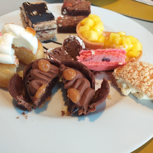 Les detallo: Macaron de frutos rojos Trufa de chocolate y coco Opera de café Tarta toffee y chocolate Choux craquelin Baba al rhum con chantilly y naranjas confit Sable de frutillas con crema de vanilla Brownie Scon de queso Varedad de sandwich salados