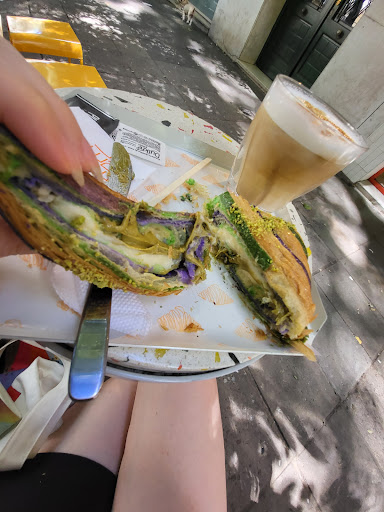 Read moreThis bakery is fabulous, I cannot stress how good their special pastries are. I couldn't finish a croissant by myself because of how buttery, scrumptious and full of filling they are. But that won't indicate it's not good - it's just super big, full on filling. I had their famous pistachio croissant. Oh my god, the patissiere is very light, and the pistachio cream, it's like a white chocolate Nutella with pistachio. It is delicious, really. The flakiness, buttery taste of a fresh croissant. Their coffee is good, but I didn't quite dig the almond milk. I think these treats are great to share with people, just four croissants to bring somewhere and everyone would enjoy. You can see people making and filling the fresh croissants in front of you (they have flavors such as patissiere, mango, raspberry, chocolate) and you can have your bite and your sip on the sidewalk seats....