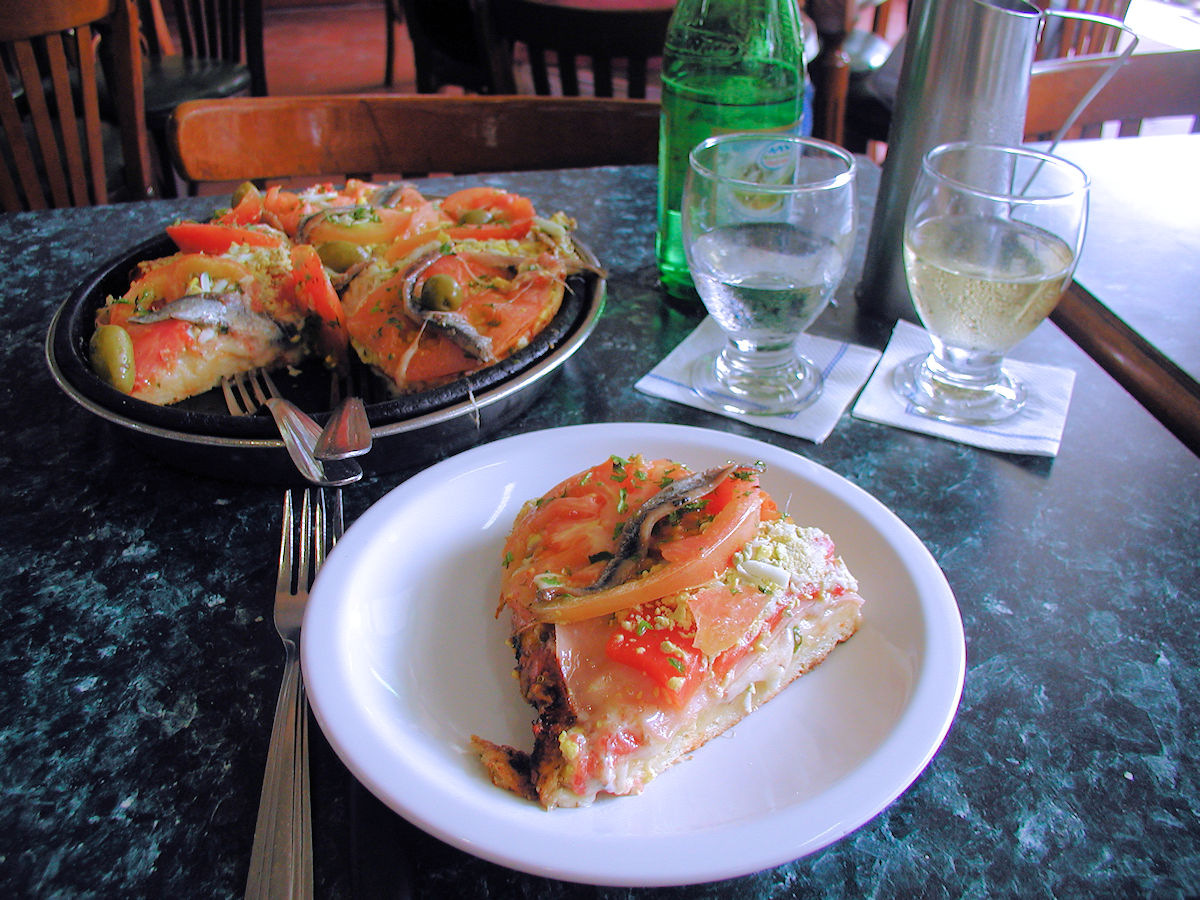 It is a very busy place with people eating standing at the counter, but tables were available. Two of the waiters ignored us, but a third one was very helpful. We ordered the Fugazza (pizza with onions and cheese) and Fugazzeta (same with extra dose of cheese). A Neopolitan would call the bread in these pizzas as "focaccia", not a pizza and I would agree. The wine was cheep white wine and sweet even though we asked for "seco" (dry white). We ordered the empanada which was very salty and not worth ordering again.