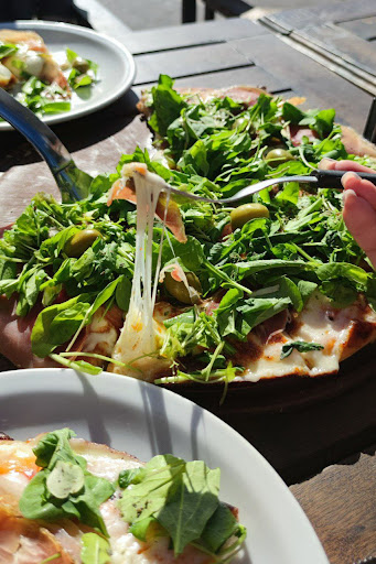 Crudo con rúcula - пицца с хамоном crudo, сыром, морем из руколы и оливками с косточкой. Очень толстое тяжелое тесто из которого могло получиться три-четыре основы для пиццы. Большая порция сухой пиццы. Тяжело есть.
