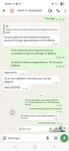 Read moreOjo con este lugar. Paso a explicar. Me entregaron mi pedido y ademas unos sanguches que no pedí, yo no estaba cuando los trajeron, quien los recibio no sabia el pedido que habia echo y obviamente comieron lo que les entrego el delivery. Un rato despues llaman para reclamar que se los devolvamos y se los querían llevar al otro cliente, osea sin importar que pudo ser tocado o lo que sea por otras personas, UN ASCO. Me sigue llamando desesperadamente para que le pague $33000 por los dos sanguches que llegaron de mas, claramente me negué ya que no fue mi culpa ni me parece bien que le den eso a otra persona por lo que imagino que debían tirarlos, pero ante tanta insistencia accedí a abonarlas la mitad, no conformes con eso siguen insistiendo en que les pague el total. Unos caraduras y sucios. Sepan que pueden recibir pedidos manoseados por cualquier otro cliente. Y ojo que si el cliente se enoja puede que esté mas que...