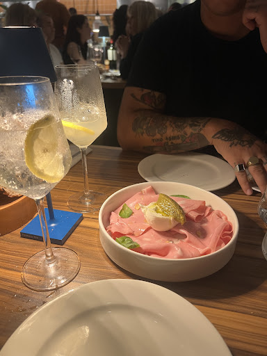Nuestra experiencia en este restaurante fue bastante decepcionante, especialmente porque lo habíamos elegido para celebrar nuestro aniversario. Aunque hubo algunos puntos positivos, las demoras, el ruido y la falta de atención a detalles importantes dejaron mucho que desear. Lo positivo: El pan calentito y la manteca fueron deliciosos, una excelente forma de comenzar la comida. La entrada de mortadela, burrata y pesto fue espectacular, un 10/10 en sabor y calidad. Nos limpiaron la mesa y cambiaron los cubiertos entre platos, un detalle que demuestra cuidado en el servicio. La comida principal estaba bien, aunque un poco insulsa, y las porciones eran bastante justas. La salsa de tomate picante en uno de los platos sabía a salsa de tomate de caja de supermercado, pero el relleno de los agnolottis de carne era muy rico. Nos ofrecieron un postre gratis como disculpa por la gran demora, algo que apreciamos. Elegimos el flan con dulce de leche y crema, no estaba mal, pero he probado mejores.