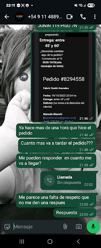 Read moreEl sushi es bueno, pero nada de otro mundo. Lo que es pésimo es el delivery y el servicio de atención al cliente. Pedí por la página web a las 19:45 y me llegó un mail informando que llegaba entre 45 y 60 minutos. A las 21:17 me comuniqué por WhatsApp para preguntar por mi pedido y me contestaron (bot o persona, da lo mismo) "tu pedido está en camino"...a las 22 vuelvo a preguntar y lo mismo "tu pedido está en camino. Llamo a la sucursal y me dicen que ya salió que espere en línea que iban a contactar al cadete. Luego de 6 minutos de esperar en línea, llegó el cadete...le pregunté cuándo le habían dado el pedido, y me dijo "hace 5 minutos, fue el único pedido con el que salí"... y estoy a 5 minutos en moto de la sucursal. Es decir que recibí el pedido 2 horas y media luego de hacerlo y casi una hora luego que me dijeran que estaba en camino...básicamente se cagan en el cliente una vez que les...