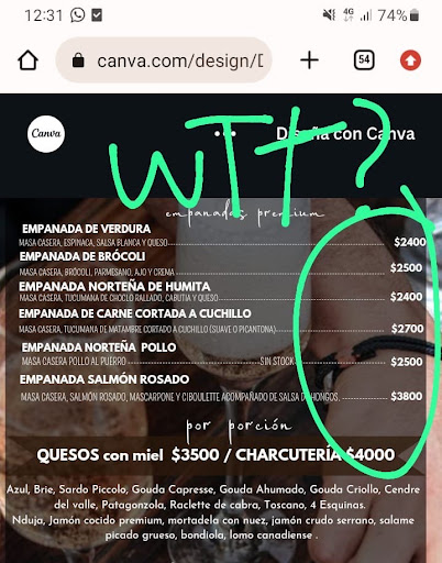 Read moreLEAN ANTES DE IR: fuimos por una salida tranqui con dos amigas, pero lo que nos pasó ahí fue super antiético! llegamos, elegimos lo que queríamos y como estaba todo bastante elevado de precio elegimos bien lo que íbamos a consumir con base a esto. al pedir la cuenta el vino que era 13 mil nos pusieron 15 mil, nos quejamos y mostramos en la carta y lo cambiaron bien. cuando llegó de vuelta me di cuenta que las empanadas también vinieron mal el precio, pero al mirar la carta de vuelta (un QR que direcciona a Canva) vimos que habían cambiado el precio en la carta también, mientras estábamos sentadas allá! la más nueva estafa por escusa de la inflación, realmente ahí los precios cambian a cada hora. obviamente nos quejamos pero no querían creernos, dijeron que era imposible que eso hubiera pasado ya que los de ahí no tenían acceso, nos llegaron a decir "paguen lo que quieran" "eso no tengo como decirles" "pero donde miraste esta carta? donde la escanearon?" con un tipo de soberbia en la cara y como si nosotras estuvieramos mal. me sentí manipulada y estafada! después que nos fuimos (aceptaron dar el descuento al final pero como si tuvieron haciendo un favor) vimos que teníamos prueba porque una de nosotras sacó un print antes sin darse cuenta. ojo: fíjense bien y saquen print de la carta porque te hacen pasar por loca.