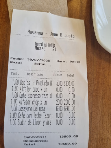 El lugar y la comida, a veces traen los rellenos fríos pero en general zafa y los.productos Havanna obvio son de lo mejor. En San Martín y J.B Justo, un DESASTRE la atención. Esperamos casi 20 min durante los cuales el "mozo Thiago" pasaba al lado de mi mesa yendo y viniendo y riéndose con la seudo encargada, que se la pasaba cantando y paveando en vez de mandarlo a atendernos (ya que la mesa estaba frente a ella y nos vieron de sobra) Cuando por fin se acerca (porque le hice seña preguntando si podían atendernos) y le pedimos 2 cafés, dice que ya cierran en 5 min. Le dijimos ok, que los traiga... Pero parece que prestó mucha atención a lo que comentamos en la mesa, que la atención siempre es pésima en ese lugar...A lo cual al momento de servir encima que supuestamente "teníamos que apurarnos" vino a responder donde nadie lo llamó, y se quedó a increparnos y exigirnos que no hablemos delante de otros clientes...Como si fuera que nos paramos con un megáfono a insultarlos delante de todos jajaja por favorr infumables!! Sres.de Havanna, imploramos a Dios que hagan un bien a la comunidad y le den lugar a gente con ganas de laburar!! En otra oportunidad habíamos ido con el cochecito de mi gata anestesiada y casi nos sacan a la calle diciendo que está prohibido!! Parece que todo es motivo para atender re mal, osea chusmean todo, lo que hablás y lo que traés en un bolso o cochecito super cerrado...En lugar de hacer su trabajo con ganas y buena predisposición. De terror, la tipa una desubicada total, me gritó desde el mostrador que no tengo derecho a filmarla, pero ellos sí se creen con derecho a hacernos pasar un garrón, cuando lo único que pedíamos era tomar 2 cafés en un...