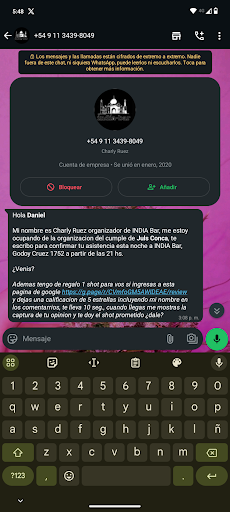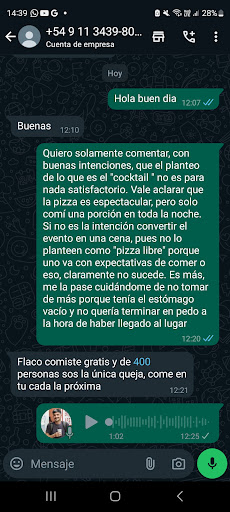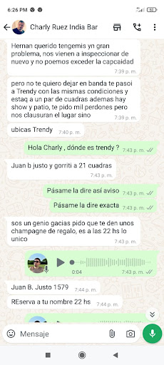 Read more[27/8, 09:33] Marce: Hola Buendía [27/8, 09:34] Marce: Charly [27/8, 09:34] India Palermo by Charly Ruez: Buenas [27/8, 09:34] Marce: Podrás hablar por teléfono conmigo ? [27/8, 09:34] India Palermo by Charly Ruez: Te Leo [27/8, 09:35] Marce: Cuando puedas hablar llámame , son varias cosas que quiero saber [27/8, 09:35] India Palermo by Charly Ruez: Solo mensaje [27/8, 09:35] Marce: Tengo 50 personas para el sabado [27/8, 09:35] Marce: Bueno entonces no [27/8, 09:35] India Palermo by Charly Ruez: Este sábado? [27/8, 09:36] Marce: Gracias por tu atencion [27/8, 09:36] India Palermo by Charly Ruez: Ok no se que te hace sentirte estrella y que tenes que hablar si o por teléfono bajate del pony que no sos nadie especial [27/8, 09:36] India Palermo by Charly Ruez: Yo decido si la comunicación telefónica vale la pena o no, vos NO [27/8, 09:36] India Palermo by Charly Ruez: De naaaada [27/8, 09:37] Marce: Estrella no soy una persona que cumple 64 años y no entiendo lo estrella que te sentirás vos en todo caso [27/8, 09:37] India Palermo by Charly Ruez: Además creo que ya estas grande para India chau [27/8, 09:37] India Palermo by Charly Ruez: Perfecto 64 no da [27/8, 09:37] India Palermo by Charly Ruez: Adiós [27/8, 09:38] Marce: Ah ahora entiendo todo , esto va a las reseñas de Google ,y pensar que me recomendaron este lugar tu...