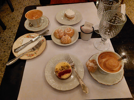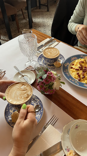 Fuera de eso, el ambiente también es ameno y agradable, hermosa y delicada la vajilla, y en cuanto a la comida, pedimos: -Flat White con leche de almendras 2/5: sabor normal, es similar al de un bar de barrio pero a precio de cafe de especialidad. Y el tamaño de una tacita de té. -Cheesecake invertido 4/5: riquisimo, porción pequeña (aprox palma de la mano), bien fresco, original. -Alfajor de coco con dulce de leche 5/5: proporcion tapa-relleno super bien, se nota que son caseras las tapas, el dulce de leche es rico y el tamaño estaba bien. -Alfajor de merengue con relleno de café (nombre ucraniano) 4/5: muy bien los sabores, las proporciones también estan ok, pero es muy chico para el precio. -Profiteroles que venían con el café 5/5: es original que te den esto en vez de una galletita insulsa, el tamaño re bien, esponjosos y rico el relleno, aunque no era pastelera.