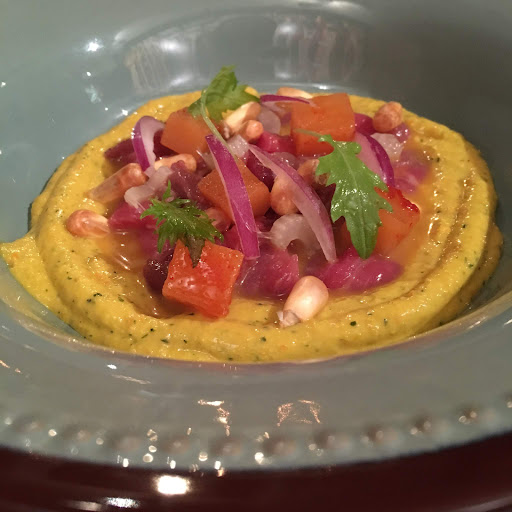 Nalga - amarillo aji + leche de tigre + sweet potato (200 pesos, $12): The slivers of rare beef in creamy aji sauce was delicious. It was tart, but not overwhelmingly so. The corn kernels and sweet potatoes added to the flavor profile and texture.