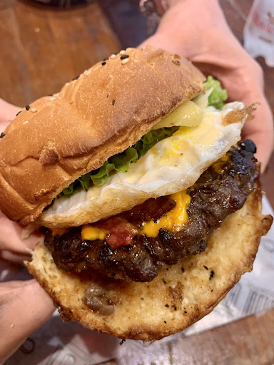 🍔Hamburguesa “La Juana”: Medallón súper casero de carne y cerdo, lechuga, tomates confitados, panceta, huevo, cheddar, cebollas caramelizadas y pepino 🍳