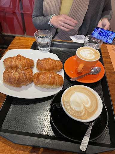 Непримечательная кофейня в утреннее время. Столиков всего 4-5, есть барная стойка на улице, но сейчас на дороге ремонт. Схема заказа: заказываете у бара, оплачиваете, там же забираете заказ. Выпечка за стеклом в 10 утра была в малом количестве и выглядела вчерашней, но на удивление - нам попалась свежайшая.