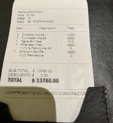 Desempeño del personal: La atención de los mozos fue muy amable y atenta en todo momento. Al pedir el postre, también pedimos dos cafés cortados, a lo cual el mozo nos preguntó si los cafés los servía con el flan. Muy acertada pregunta, que demuestra el dominio del oficio. Al pedir la cuenta, el mozo la acercó y llevó la tarjeta. El manager de salón se acercó a la mesa para traer la tarjeta con la factura y el comprobante del pago realizado, preguntando cómo había estado todo y agradeció por la visita.