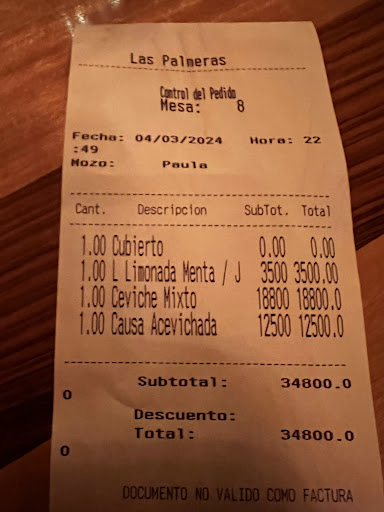 Read moreLos finde no me gustar agarrar el auto, asi que cuando mi hija y yo buscamos un restaurante para cenar el sabado suelo buscar a tiro de caminata. Y es asi que creamos nuestra lista de restaurantes, casi siempre etnicos, alrededor de mi Barrio. Mirutaki para la Japo, Cangtin para la Viet-Thai, AlZain para la Arabe, pero nos faltaba un buen peruano, cocina que nos afacina a los dos. Y alli aparecio Las Palmeras Cañitas, en Soldado de la Independencia 1073, Buenos Aires. El local me gusto mucho por su elegancia minimalista pero calido y acogedor al mismo tiempo. El servicio de primera gracias tambien al mozo Jonathan que se lució con una atencion notable sin caer en el agobio. Nos recibieron con dos excelentes mini ceviche servidos en concha de vieira y tuvimos la instantanes convicción que era el lugar que buscábamos. Pedimos una entrada compartida, conchas a la parmesana, osea vieiras gratinadas con parmesano. Eleccion de mi hija ya que en mi cabezita Italiana nunca pediria un pescado o marisco con queso, però fue un acierto. Un equilibrio muy conseguidos de sabores que se concretizaron en un plato redondo y delicioso. Luego yo pedí un Ceviche Mixto y mi hija un Aji del Inca. Y aqui encontramos las emociones. El ceviche mejor que comí hasta el dia, perfecto y equilibrado, abundante y esquisito. Con el justo picante, el pescado y el marisco resaltados por una leche de tigre de leyenda. Riquísimo tambien el aji, con una base de papas laminadas el aji con pollo desmenuzado y langostinos, un picor sostenido debido a una salsita de rocoto que nos levaron a parte y que me hija echó generosamente ..... un arroz blanco lo acompañaba . Otro plato muy conseguido, generoso en cantidad y en satisfacion. Una limonada, una Cerveza Cuzqueña al Trigo y dos aguas acompañaron la cena y no quedó lugar para postres. 56000 pesos en total, mas que rezonables por el festin que nos representó. Seguramente volveremos a probar algo mas de la extensa...