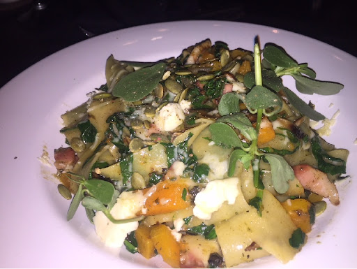 De plato principal pedimos una carne a la manteca con papas y unos sorrentinos de conejo, cacao y mascarpone con hongos salteados. La carne estaba muy rica, en su punto justo y jugosa, lo único que valió la pena. Los papines estaban algo secos. Pero los sorrentinos tremenda decepción: no es que tenían mal sabor es que directamente NO tenían sabor y estaban sobrepasados de condimentos y vino blanco. No hubo sabor que pudiera identificar: no podia distinguir ni el cacao, ni la carne o el mascarpone . Los hongos ni siquiera tenían sabor porque todo estaba embadurnado de una salsa MUY fuerte y excesivamente especiada (que a mi parecer no era necesario) y un sobrepasado sabor a reducción de vino blanco que opacaba todo el plato. No lo pude disfrutar, podía estar comiendo cualquier otra cosa que no me daba cuenta. Los platos engañan mucho con la presentación, son muy pintorescos y se ven abundantes pero el sabor nada que ver.