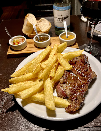 The food and drinks are plentiful and all reasonably priced. I had a wonderful Rib Eye grilled steak with fried potatoes and a generous and super-fresh salad. The three different chimichurri sauces, served with the warm bread - is so tasty. The house wine was a excellent Malbec that was quite delicious.