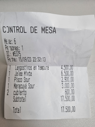 Read moreFui básicamente para hacer tiempo este sábado alrededor de las 14:30 y vaya que me llevé una grata (y sabrosa) sorpresa. Debo decir,sin dudas,que fue mi mejor experiencia gastronómica del año (no incluye parrilla ni pastas caseras,desde luego). El sabor de las rabas no recuerdo haberlo disfrutado tanto en ningún otro bar/restaurante. Ahora,la carne salteada con arroz y papas fue celestial. Ni hablar,el exquisito pisco sour con el que acompañé el menú mencionado. Y mención aparte,los pocillos en qué sirvieron tanto mi trago como el Campari elegido por mi mujer: muy original y de buen gusto. La atención de primera y los precios razonables. Hemos comido en las mesas de afuera,así que no puedo opinar del salón (mucho menos de los sanitarios). Pero prometo regresar muy pronto a degustar un arroz chawfa,unas papas a la huancaína o un buen ceviche (ineludibles manjares de la excelente cocina peruana). Única cuestión desfavorable: no tenían Inca Kola....