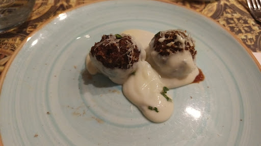 La propuesta gastronómica es un auténtico homenaje a la cocina tradicional: Para iniciar, nos sirvieron albóndigas de carne acompañadas de una fondue de queso, un primer bocado que evocó aquellos sabores caseros llenos de calidez y autenticidad. La segunda parte se destacó por dos creaciones: unas pastas con frutos de mar que fusionaron la frescura del Mediterráneo con la técnica italiana, y una crema de calabaza con jamón crudo crocante, cuyo contrapunto entre la suavidad de la calabaza y el toque salado y crujiente del jamón despertó una explosión de sabores en el paladar. Cada plato, en su justa medida, estaban elaborados con ingredientes frescos y con una impronta que respira tradición y calidad, se nos presentó de manera sencilla pero con un inconfundible sello de clase. Finalmente el cannoli crujiente y el helado de pistacchio suave, cerro la noche. Acompañamos con una copa de vino blanco y tinto, para degustar cada uno de los diferentes platos y agua para hidratarse. La atención y el servicio se sumaron a la experiencia. Más que una simple cena, la velada se convirtió en un viaje sensorial y emocional, donde cada elemento –desde la ambientación hasta el último bocado– es un puente entre el pasado y el presente.