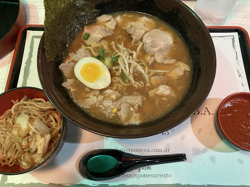 Restó: La comida muy rica, no es cara en sí para lo abundante que es. Lástima que tal vez podría tener más variedad de platos, ya que es: ramen distintos tipos, udón distintos tipos, sushi y unos platos especiales (que son milanesa con arroz a lo japonés, arroz salteado, el curry lo más rico, y pescados salteados con varios acompamientos). Las entradas son pocas pero buenas. Los postres no valen mucho la pena, son solo cuadrados de torta muy chicos e industriales. El personal siempre agradable. Suele haber demora para entrar. Lo malo es lo TERRIBLEMENTE ruidoso que es el espacio; no sé puede hablar casi, y escuchas todo lo que dicen las otras mesas (a veces más que la propia). Y el set del katsu kare decepcionante la última vez más que nada: una ensalada de pura lechuga con una rodaja de tomate, la clásica sopa de miso, y tres cuadrados de tofu frito (no me gusta el tofu, que bastante particular es); siendo que a mi novio con el udón le tocó un set mucho mejor con pollo frito, unos fideos negros muy ricos, hasta un bao!!