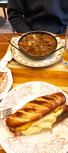 Atención normal, nos sentamos adentro, demasiadas mesas y sillas para el espacio disponible, fui al baño ( un baño de mujeres con todo lo necesario pero ya sucio) y me costó salir y no hablar volver, tuve que intentar por dos caminos diferentes. Almorzamos, una carta poco tentadora. Gaseosa de botella de vidrio o sea de las de bar pequeñas. Yo comí un sándwich poco desabrido y poco atractivo a la vista, le faltaba algo fresco para equilibrar. El otro plato lentejas que dentro de todo tenía sabor casero. Yo quería pastel de papas pero me dijeron que no había. En un momento vinieron a perdimos que nos pasemos a una sola mesa porque éramos dos en una mesa armada para cuatro, por si venía las gente o sea al poco espacio menos y sinceramente eso a mí me molesta, para eso pedime que me retire, a eso el calor humano por tampoco espacio hizo que nos fuéramos a tomar el café a otro lado. Gastamos $3710 por una cerveza de 710 ml, 2 gaseosas, un sándwich de carne y un plato de lentejas. Rico las tostaditas y queso que te traen de entrada.