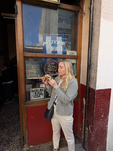 The choices are few. Mozzarella. Anchovy (without cheese). Ham and Pepper (with cheese). Fugazza. Fugazza con queso. Fainá. That’s it. By the slice to eat there, or a whole pie, small or large, to go. For the pizza by “the slice”, they make them in huge, 60cm molds, and then cut pieces in more or less random shapes of more or less the same size and served up on a minuscule paper napkin. Is it worth it? No. Not really. It’s perfectly acceptable pizza, and even a decent fainá (chickpea and cheese “bread” that’s often used as a second dough topping to pizza here). And it’s among the better in San Telmo, but honestly, that’s a low bar. As I said, it’s an experience, and if you want to do something truly authentically Argentine for pizza, it’s worth a...