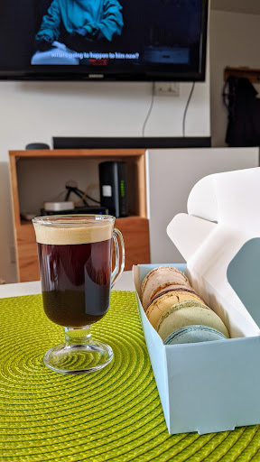 Ahora bien, el café no era bueno, o sea bien presentado y todo... Pero estaba aguado y medio quemado. Pedí una pieza de pastelería (una "coronita" con crema pastelera), de sabor normal, pero no era fresca. Para terminar me pedí un macaron de frambuesa, el mismo no tenía ganache de relleno, sino una mermelada (nada especial tampoco).