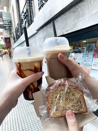 ☕️ Ambos cafés estaban muy ricos y super frescos. El tamaño esta bien y no hace falta ni endulzarlos. Te dan sorbete de papel que a la larga se termina desarmando. Es mejor tomarlo desde el vaso. 🍌 El budin de banana cumplía. Estaba un poco seco pero tenia buen sabor.