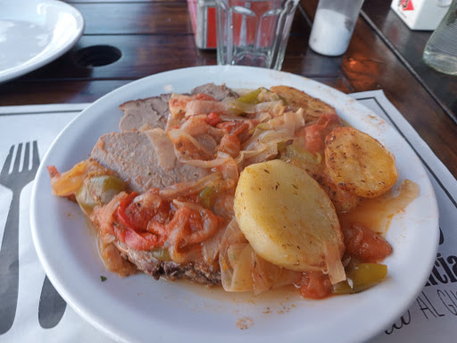Read moreTema comida: Comí tapa de asado con papas al horno. Vino apenas tibio y solo traía 3 rodajas de papas y media. Muchísima cebolla y morrón para llenar el plato. La carne muy tierna. Tema ambiente: Comí en la carpa exterior. Pasó un 113 y chocó levemente la punta de la carpa donde yo estaba. Porque la carpa ocupa espacio sobre la calle. Si venía más rápido el colectivo podría haber sido un mal momento. Tema atención. Atroz!!!. El mozo nos trajo la bebida y la dejó fuerte en la mesa mojando el individual. El jugo de naranja vino natural. Durante los 30 minutos entraron 5 vendedores ambulantes a vender. No les dicen que no pueden entrar. Caso puntual de un adolescente que pedía limosna. A ese si lo trataron re mal. Le ofrecimos comida de nuestro plato y le pedimos al mozo si se lo envolvía porque tenía mucho líquido y cebollas/morrón encima. No lo quizo envolver y le grito al chico: comelo!. ¿Qué queres que yo te lo de de comer!!. Pobre chico. Lo hicimos sentar en la carpa y comío la comida. Al mozo le molesto que se siente y se fue de mala forma. Al momento de entrar a pagar lo vimos que tiraba un resaltador en la mesa y le contestaba mal al cajero. No volvemos más. Un poco de empatía. Es un mediodía helado y se lo trató re mal al chico. No culpo al dueño sino al mozo....