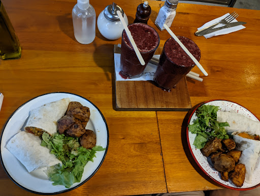 Las personas que atienden son muy amables y la comida es riquísima. Pedimos 2 platos vegetarianos de Wraps($6000 dos mitades por plato) relleno con zapallo, hummus de berenjena, zuccini y tomates confitados, estaba muy muy rico sirven abundante, venía con papas con cáscara al horno condimentadas y sabían muy rico y un poco de ensalada con aderezo que creo era con algo de miel, aceite de oliva y semillas de lino y sésamo, era suave de sabor y quedaba muy bien en la lechuga. Todo esto abarca el tamaño de un plato mediano. También pedimos dos licuados de frutos rojos(había para elegir esto con agua, leche o jugo de naranja) pedimos con jugo de naranja y estaba muy rico, era un licuado con mucho sabor, algo espeso y el vaso es grande. Te lo dan con palito para mezclar y un sorbete biodegradable.