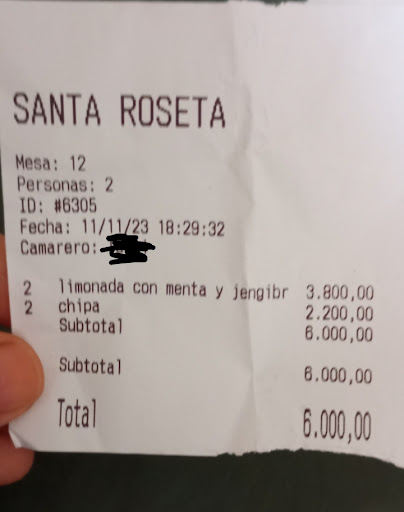 Fui con mí madre a Santa Roseta, un sábado por la tarde, el lugar realmente muy bien ambientado , lo que lo hace único sin dudas es la vista del extenso jardín del edificio al cual pertenece. Lamentablemente ese día en el fondo del recinto habia una celebración ( no sabemos bien si de cumpleaños, o de tipo laboral) lo que puso de manifiesto la pésima acústica del lugar ya que apenas podíamos conversar. Pedimos dos limonadas y dos chipá. La limonada , correcta , en vaso alto, pero como viene sin azúcar ( lo cual me parece bien) pedimos unas cucharitas para agregarle azúcar o edulcorante y poder mezclar. Las chicas que nos atendieron nos dijeron que no tenían cucharitas altas y nos trajeron unas fichas de café que, para revolver la limonada tuvimos que meter la mano adentro. Cómo es posible que ofrezcan vasos largos y no tengan con qué revolver , ni siquiera un sorbete nos trajeron que hubiera servido mejor para eso. En cuanto al chipá era un bodoque incomible que se ve que calentaron en el microondas. Tenía poco queso , y tal vez harina de maíz además de la fècula de mandioca. Vamos a volver porque nos gustó el lugar , pero pediremos otra cosa( la vitrina de las tortas se veía correcta,y bien surtida), y muy seguramente no vayamos un sábado. Los precios acordes al lugar en pleno Belgrano( adjunto foto, cubriendo el nombre del camarero/a ), el...