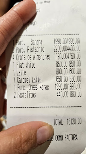 Aún en un país en constante crisis, con una devaluación galopante, pedimos varias cosas para comer allí y otras para llevar (4 porciones de tartas/ tortas, 4 croissants de almendras, 2 pastelitos y 3 cafés).