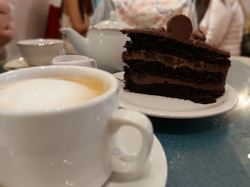 I went there today for the first time. I loved it and I will be going back. The service was outstanding. The tea room itself was beautifully decorated. They played the best music and at a normal volume. 80's classics and in English. This is the place I choose to go back and give my English classes to my adult students. The tables are well separated from each other which allows us to hear the person we have in front of us. I only had 2 coffees with a bit of milk. Great coffee. A piece of chocolate came with the coffee. Really good chocolate, I liked it so much, I bought an Easter egg made with that...