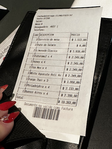 Read moreSolo pongo 1 estrella porque el sushi es rico !! Ahora pongo las críticas, voy con club la nación que tengo martes y miércoles descuento el 20% y 2x1 en tablas, les aclaras que vas con dicho beneficio, para que apliquen el descuento y te traen el ticket y no ponen ni el 2x1 (combinados) ni el 20% en el resto de las cosas, les avisas y te lo corrigen y te ponen el 2x1, les tenes volver avisar del 20% van y lo corrigen otra vez, osea un ticket 3 veces, deduzco que lo hacen para cuando vos te retires hacen el ticket fiscal con todos los descuento y ese dinero se lo quedan ellos, el otro día sume y eran 18mil que si no reclamo se lo quedan ( porque cuando pagas te da un ticket no valido y cuando te retiras hacen el ticket fiscal) otra, pedí un campari, 3 veces lo devolví porque no tenia gusto, se lo hago probar y efectivamente no tenia alcohol, traen la botella y resulta que era agua y no supiera descubrir como la rebajaron o la manipularon ( granadina o algún tipo de colorante ) la encargada dijo que algún empleado se lo estaba robando!! Osea hay que pasar por eso, y por último tipo 22 horas apagan los aires para que sientas el calor de pleno enero 40grados y te retires, prefiero que me traigan la cuenta y listo ✅️ Ahora entiendo porque las cadenas se funden por más que la...
