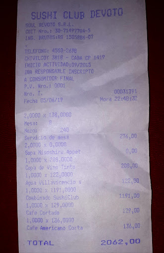 Read moreQué decir.. el mejor sushi lo encontrás en este restaurante!! Piezas super suaves gustos únicos, ambientación relajada, muebles cómodos... super cómodos, belleza de arquitectura y la temática del local es muy agradable, servicio de mesa excelente siempre atentos es lo que más destaco te atienden muy bien pero realmente el sushi es el mejor que probé no hay dudas!! Los precios son bastantes elevados pero vale la pena por todo lo que ofrece este lugar.. en la página de Sushi Club ofrecen beneficios con una "Clave 21" pero entrás a la página para registrarte y se tilda, no anda o no es la página correcta.. por ende nunca me funcionó esta promoción pero a pesar de este inconveniente el lugar es hermoso vayas a cual vayas desde el Sushi club de Devoto hasta el de Puerto Madero!...