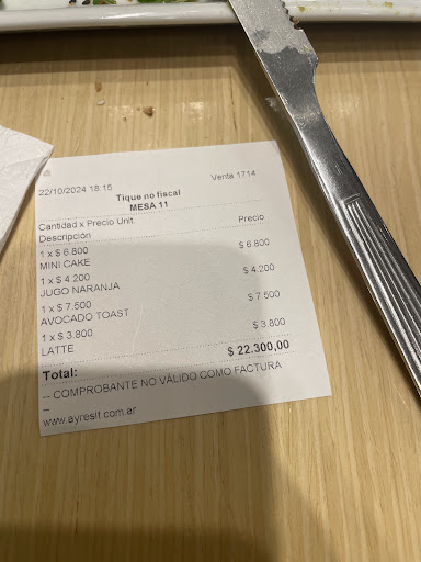 Read moreSi querés comer algo tipo 8 de la noche...la cocina esta cerrada...una pena, tenía huevos revueltos, arabe de jamón y queso y sándwiches de pollo que nos quedamos con ganas de probar(fuimos con la idea de comer algo salado con el café) a esa hora solo nos ofrecieron productos dulces tipo alfajores, medialunas o porciones de torta. Mala impresión por ser la primera vez( trabajé en cafetería y la cocina cerraba cuando cerraba la puerta), nos hubiese avisado ni bien nos sentamos, sin embargo lo hizo cuando intentamos hacer el pedido, vale aclarar que tardó en tomarnos el pedido, es una sola chica para todo el local, distraída o simplemente es mucho para ella sola, pedimos tres bebidas ,no era una mesa de 10 y volvió a preguntar si era café con leche, pedimos ML de grasa y trajo de manteca, más allá de lo superada que pueda estar ,estaría bueno que esbozara...