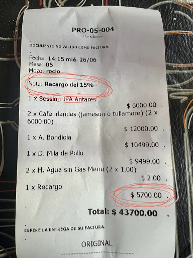 Read moreThe staff seemed hungover and thoughtless, even with a bad hangover I can move faster and say hello to people. Waitress said we don’t make Irish coffee so we showed her the menu and they managed to make them for us. The bread was served right out of the refrigerator and I also have to get up and serve myself to a napkin tray and the sauce rack of ketchup and mayo. Pork chops were warm only and my milenesa de pollo(breaded chicken) could have been used as a frizbee. Plus a sure charge for using a credit card of 15%. I have seen worst but I don’t intend to ever go back or recommend this...