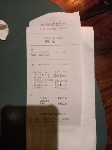 Atención pésima de la moza, que no tengo idea por qué, pero toda la noche, desde que nos sentamos, estuvo intentando que nos fuéramos. Nos apuró para realizar el pedido, nos apuró retirando el pan que traen de entrada, cuando aún yo lo estaba comiendo. He ido otras veces a Tomate y el pan, en general, lo dejan en la mesa, así que no entendí su desesperación por levantarlo. Luego trajo los platos y vino a levantarlos aun cuando yo estaba comiendo. Otra vez, totalmente apurada. Cuando levanta todo, me pregunta si queríamos algo más, a lo que le respondo que en un ratito le pediremos algún postre. Ella nos dice “bueno” y luego dice “tengan en cuenta que a las 00:00 cierra la barra, si desean algo de ahí”. Luego, cuando le pedí, alrededor de las 23:50, el postre —que aclaro: yo elegí ir a esperar mi cumple a Tomate porque, sobre todo, quería comer el volcán de chocolate, como el año anterior—, ella nos responde: “yo les aclaré que la cocina cerraba a las 00:00”, y entonces todos pensamos que ella aclaró lo de la barra, pero nos dimos cuenta de que no servía debatir, porque la cocina claramente estaba cerrada y ella lo había comunicado mal. Además, en Instagram figura que el horario es hasta la 1:00 a. m. y que la barra es hasta las 2:00 a. m., por lo cual es todo muy confuso. Básicamente, a partir de allí hizo todo lo posible para incomodarnos más con su actitud y luego nos trajo la cuenta diciendo que cerraban en un ratito. Por lo que empezamos a ver cómo abonábamos y vino de nuevo a querer apurarnos, cuando no nos dio ni cinco minutos. Un desastre. Jamás pensé que me iba a arrepentir tanto de haber ido a Tomate a esperar mi cumple. Salió muy mal. En ese momento, ya mi amiga le respondió de mala gana (con justa razón) que espere, que estábamos dividiendo el dinero. Bueno, realmente terminé sin postre, siendo apurada todo el tiempo y, encima, con error en los horarios, incluso error de ella también, diciendo que cerraba barra y no cocina. Mala aclaración. Además, cabe aclarar que en Google figura que abren hasta las 2:00 a. m. Un error, porque nos echaron a las 00:30, con mi hermano aún terminando su bebida a las apuradas. No creo que tenga muchas ganas de volver a Tomate nuevamente después de esto. Me tomé el tiempo para que sepan que me hicieron sentir pésimo y que está bueno cuidar al cliente que elige una noche tan importante como su cumple... El manager (asumimos) que se encontraba en la zona de la barra mostró desinterés cuando supo de esto tampoco nos preguntó nada ni vino a disculparse por el error...