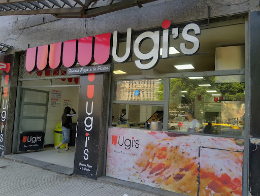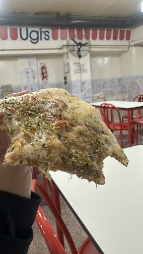 Ugis is a low-cost pizza chain from Argentina. It's like godfather pizza except that the godfather got mugged and now is homeless. There us only two flavors of pizza. Muzarella (or "musa") and Fugazzetta ("cebolla" (onion)). Ugis aims to be the cheapest pizza in town. The pizza is delivered very hot, but turns cold suspiciously fast. I recommend to ask half pizza per person, and if you stay hungry ask another half. There are some rectangular pieces of paper near the counter. Those are supposed to be napkins. They'll ask you if you want oregano in the pizza. There are also empanadas, which are good for the price (right now around 0,30 USD) but in reality they are actually pretty bad. I'm not sure this place accepts credit cards, but it accepts debit.