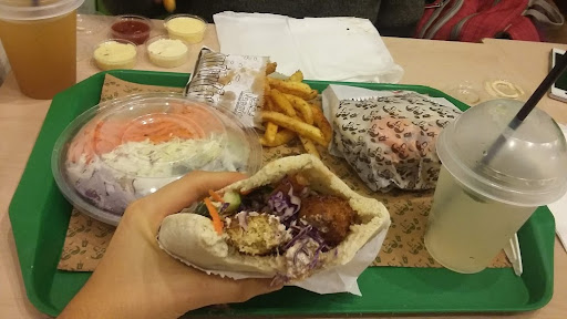 The food is great, their pita bread was amazingly good!! But I have to be honest the service sucks, I mean, it was my first time there, the menu have just names on it, the cashier girl was almost rude while explaining what “combos” brings and she only explained one, of course it’s exhausting explain it over and over but they should add a description of every dish, the one who prepared the falafel was almost the same with the sauces, and I will repeat my recommendation, put the names and descriptions of the sauces on the glass and with that you don’t have to repeat yourself 5728292 times per day, the fries were washy and cold but the taste super good, the veggies were cut by a 4 years old kid, the pieces were too big and thick I mean no technique at all, and in general the restaurant looks a bit greasy, I mean, the tray were they gave me the food was suuuper sticky and the small part you can see from the kitchen looks the same greasy and sticky and that is a result of a lack of cleanliness, which is no good on a food environment, personally I will not gonna go...