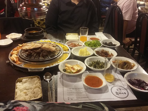 Si sos de llenarte con una ensalada y un churrasquito del tamaño de la palma de la mano a lo Cormillot tu apetito no le va a hacer justicia al despliegue que vas a encontrar acá. Es importante ir temprano y en lo posible reservar porque cierra a las 22:30 Llegás y te recibe un señor muy amable que te toma la temperatura, te pone alcohol en gel y te ubica en una mesa que tiene en el medio una parrilla y un extractor. El camarero rápidamente te llena la mesa de platitos variopintos y te pregunta si tenés idea sobre el sistema y si no la tenés te explica brevemente que la comida va a seguir llegando y que si querés repetir lo que sea lo pidas, que nadie te va a juzgar y que lo único que no está permitido es comer poco e irte temprano. Seguido del banchan (los platitos que tienen cositas varias, unos zapallitos salteados por acá, unos pickles por allá, un kimchi delicioso, ensalada y un largo etc de vegetales varios) te llega una sopa de miso que te va a sacar el frío y hasta las penas, un bowlcito de arroz, lechuga, ajos, ajies y las carnes (panceta cruda, matambrito, entraña, bife de chorizo y bulgogi) acompañadas de una pinza y una tijera para que puedas cocinarla y cortarla en la mesa. Después de un rato te traen huevo y choclo por si la comida no te alcanzaba y te dejan ser para que te diviertas cocinando tus bifecitos y jugando al asador sin el trabajo de prender el carbón ni el olor a humo en la ropa porque se lo lleva todo el extractor. El ambiente es como ir a la casa de alguien, no es super moderno ni pretencioso. Se siente como si estuvieras en el cumpleaños de un tío donde hay unos cuantos parientes que no conocés y otro par que se cortaron solos y los escuchás reirse y hablar fuerte, a mi gusto le suma un montón al ambiente, si vas en plan cena formal capaz eso no cumple con tus expectativas. Los precios están muy bien teniendo en cuenta que vas a comer un montón y que podés repetir lo que quieras, son unos $2000 por persona con agua y soju. La atención fue un poco desprolija, todavía no estamos seguros de si el camarero era nuevo o si estaba sobrepasado porque tenía muchas mesas pero parecía apurado o como si estuviera repasando en su cabeza lo que tenía qie hacer y tuvo un par de olvidos, nada grave y de todas formas lo compensó con un montón de onda. Los baños estaban limpios, había papel,...