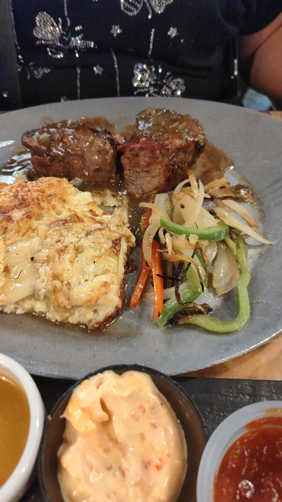 Read morePrimera y última vez, entre que es caro la comida no está ni cerca del nivel. Un lomo que no es lomo, un tapeo tristisimo ($14900: 4 langostinos rebozados, 3 pedacitos ínfimos de pollo rebozado, 4 mozzarella y dos empanaditas de copetin de carne), con esas 3 salsitas. Los platos rondan entre $11500 y 15mil. El lomo, aunq lo pases de coccion se deshace siempre, x eso es la carne básica para el q no sabe cocinar nada, este no sería el caso, capaz una bola de lomo o un cuadril cortado supongo para parecer mini medallones de lomo, el resto lo desmechan para las empanadas y las papas pacheca. Estás últimas, son rústicas fritas en aceite re pasado, negras estaban. Y a este punto, si estás leyendo estos te preguntarás xq no reclamamos? Bueno, mea culpa llegamos 23.15, 23.25 nos dieron mesa, 23.40 nos tomaron la orden, 13min después trajeron la bebida y 10 min después la comida. tal vez tuvimos mala suerte con el servicio? Puede ser, pero es la experiencia q me tocó vivir. Ah punto a parte el calor que hacía, si te toca mesa donde no llega el ventilador.preparate a qué se te caliente la bebida en 10min. El valor es solo la comida, el valor de las bebidas es el normal en...