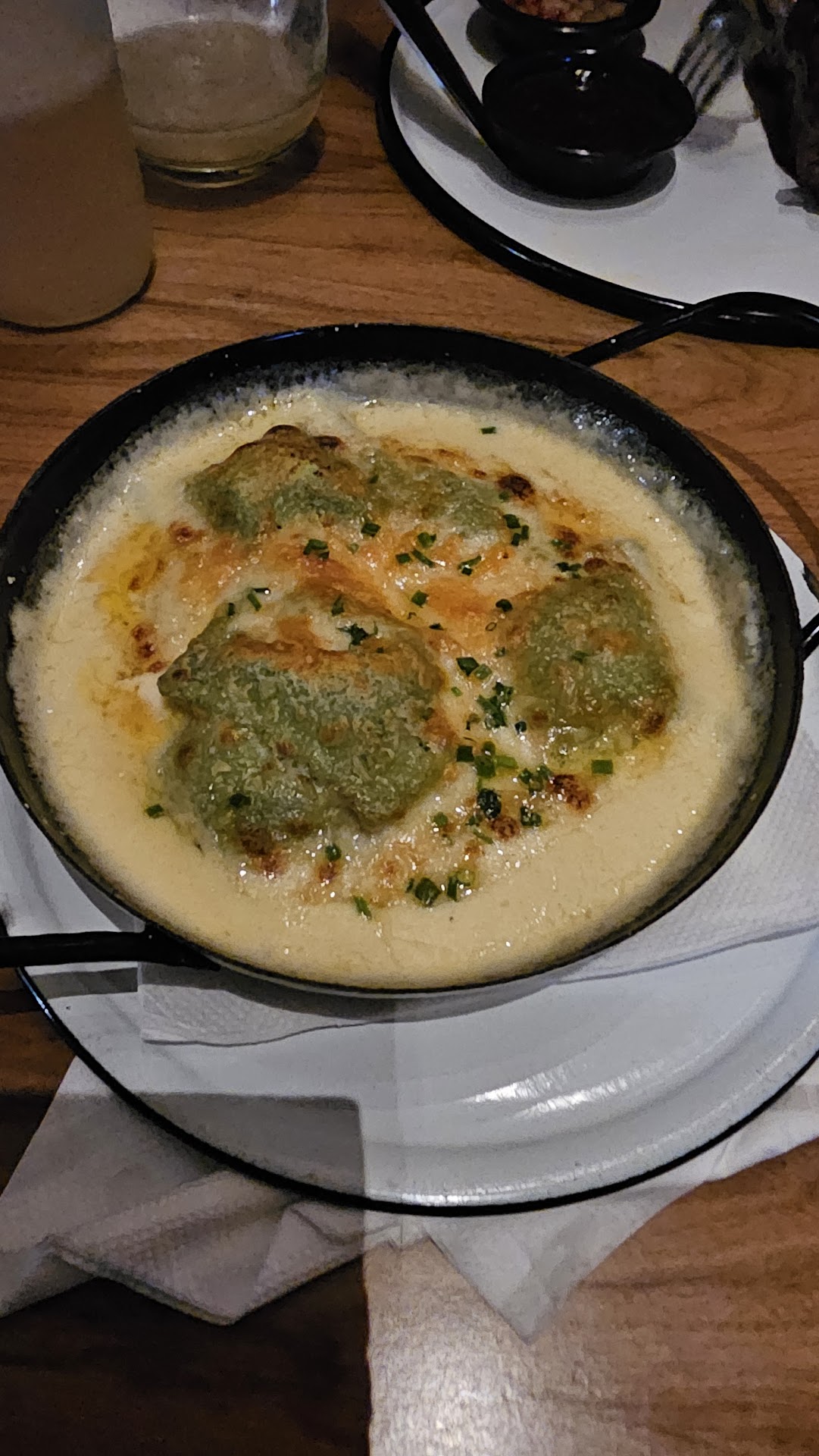 La panera excelente y renuevan el dip. Las empanadas de osobuco estaban fritas correctamente pero el relleno por dentro estaba frío. El queso no se había llegado a derretir y les faltaba jugo, quizá un poco de sal también. La criolla muy rica. En cuanto a la milanesa de ojo de bife con fideos, la milanesa estaba 10 puntos pero los fideos no tenían nada de gracia y también les faltaba sal. Los tragos muy ricos.