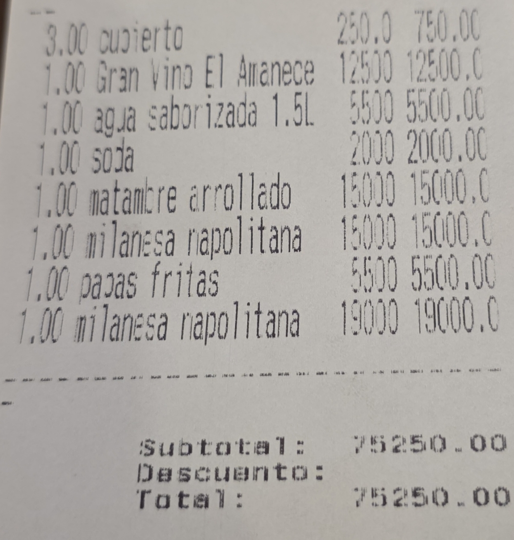 Read moreHay que hacer fila, te anotan por nombre, tienen muchos clientes. Luego de esperar 35 minutos, nos hacen ingresar, la moza que nos toco amable, le pedimos matambre de cerdo al roquefor en vez de pure le solicite papas fritas, milanesa napolitana la chica nos consulto si las milas eran simple o completa, pedimos una y una. Tardaron mucho en traernos la comida, avisando la moza que habia problemas en la cocina pidiendonos disculpas, trajo mi plato solo que No era lo que solicite me sirvio matambre arrollado... luego de varios minutos trajo el segundo plato milanesa napolitana simple... luego de varios minutos trajo la milanesa napolitana completa.... debido a tanta tardanza ya habiamos consumido las bebidas vino de la casa, dulce suave, soda, agua saborizada me imagine que tenia de marcas conocidas, me trajo una que no nos gusta, lo bueno es que son botellas grandes... Comida abundante, a pesar de que no pedi matambre arrollado, estaba rico bien condimentado, las milanesas estaban ricas, a mi padre le hubiese gustado que le consulte por el tipo de cocción del huevo, ya que para su gusto estaba seco prefiriendo poché/ escalfado. Veia que sale rapido las parrilladas, que las sirven en recipiente que las mantiene calientes. Los postres se veian porciones grandes. Cuando pase al sanitario es chico, estaban rebalsando los tachos de papeles, cayendo una gran parte de residuos al piso un asco, luego note que al lado del espejo tienen un cartel pegado que dice algo asi como "SI ENCONTRO EL BAÑO SUCIO AVISE", lo que me hace pensar que el baño sucio es cosa de todos los días, observando que los empleados del lugar utilizan el mismo espacio, no tienen otro baño privado, notando a su ingreso continuamente el mal estado de higiene del baño, no habia papel en rollo habia servilletas. No, ponen musica, lugar familiar. No volveria, no fue una experiencia para el regreso... Gaste $ 75.250, a pesar de la experiencia...