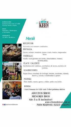 Read moreFui a pasar el día a Carlos Keen en familia y nos encontramos con este lugar para almorzar. Desde que bajamos para consultar cómo era el sistema y los servicios incluidos hasta que nos fuimos, se destacó la excelente atención recibida y la cordialidad de todos sus empleados. Para empezar, nos trajeron una picada con pancitos caseros y verduras en escabeche (que por la muy buena recomendación del mozo no quisimos comer en su totalidad para poder disfrutar de TODA la comida posterior). Luego, nos trajeron como plato caliente pollo al disco, exquisito! Súper suave pero muy sabroso. Una vez con la panza calentita nos trajeron la parrillada (incluía carne vacuna y de cerdo, y todo tipo de achuras con verduras a la parrilla), acompañada de papas fritas y ensalada a elección (nosotros pedimos rucula y cherry). La parrillada se podía repetir. Súper completo. Posterior a ello, teníamos la opción de un plato de pastas: pensas que no podes comer más, pero lo haces porque todo es riquísimo! Nuestra elección fueron unos ravioles caseros de calabaza con salsa mixta, increíbles! Por último, el postre: flan con dulce de leche y crema. Sin desperdicio alguno!! Luego, podías tomarte la tarde y recorrer el pintoresco pueblo y volver para merendar unas tortas fritas, que sinceramente no llegue a degustar pero no tengo dudas de que deben ser riquísimas. Todo esto incluía una bebida de litro sin alcohol y el previo fue de $600 por persona. Quiero destacar la excelente atención de nuestro mozo y su amabilidad en todo momento. Súper atento!! Y la comida increíble. Sin dudas, una hermosa tarde de...