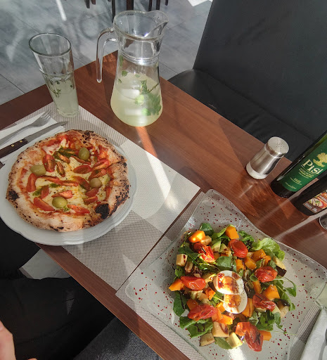 🍕🥗 Elegimos platos vegetarianos: una ensalada con mix de verdes, palta, cherrys confitados (creo), queso, calabaza/cabutia (estaba dulzona riquísima), berenjena y un huevo; una pizza individual margarita muuy bien lograda y con mucho queso. --Para condimentar nos trajeron sal, pimienta, aceite de oliva y aceto.