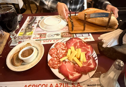 Desde el momento en que llegas, te reciben con una bebida generosa: un sifón y una copa de la casa, tan grande que te invita a quedarte y disfrutar sin medida. Y qué decir de la comida… ni siquiera necesitas mirar una carta, porque las mozas, como bailarinas en una ópera, llegan danzando con una picada espectacular de bondiola, salamin y queso, un pan flauta colosal en un “corral de pan” que parece una obra de arte, tortilla de papa, buñuelos, tostadas con pasta de berenjena y, como broche de oro, una empanada frita de carne que te hace cerrar los ojos de gusto. La consigna es clara y sabia: “Coman despacio, partan en pedazos”, y uno no puede más que obedecer, agradecido por tanta bendición. Los tiempos están perfectamente orquestados; mientras la copa de vino empieza a hacer cosquillas en el paladar, el mozo te recita con pasión las opciones de pastas, carnes y pescado. Las mollejas son un himno a la alegría, y las papas fritas, una ovación que resuena en cada bocado. Y cuando crees que no puedes más, llegan los postres: la natilla con caramelo y canela y el tiramisú, tentaciones que no podes resistir. La atención es impecable, cálida y profesional, haciendo que te sientas como en casa. El precio, considerando las entradas, vino, soda, dos platos principales y postres, es de $33.000 por persona, una inversión que vale cada peso por la experiencia.